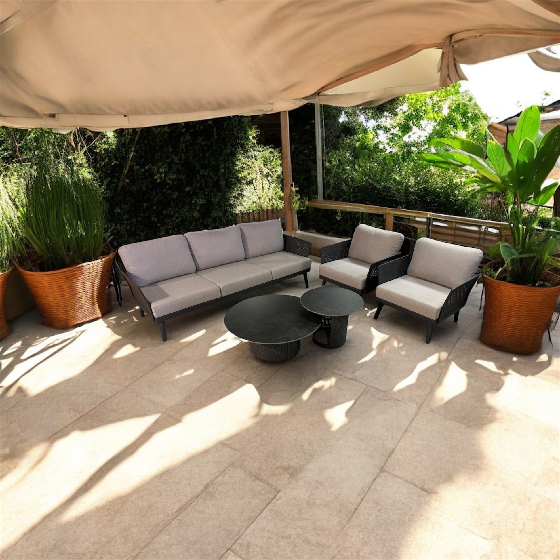 Brussels lounge is modern aluminum setting with punched hole design. the coffee table top is made of Sintered stone.